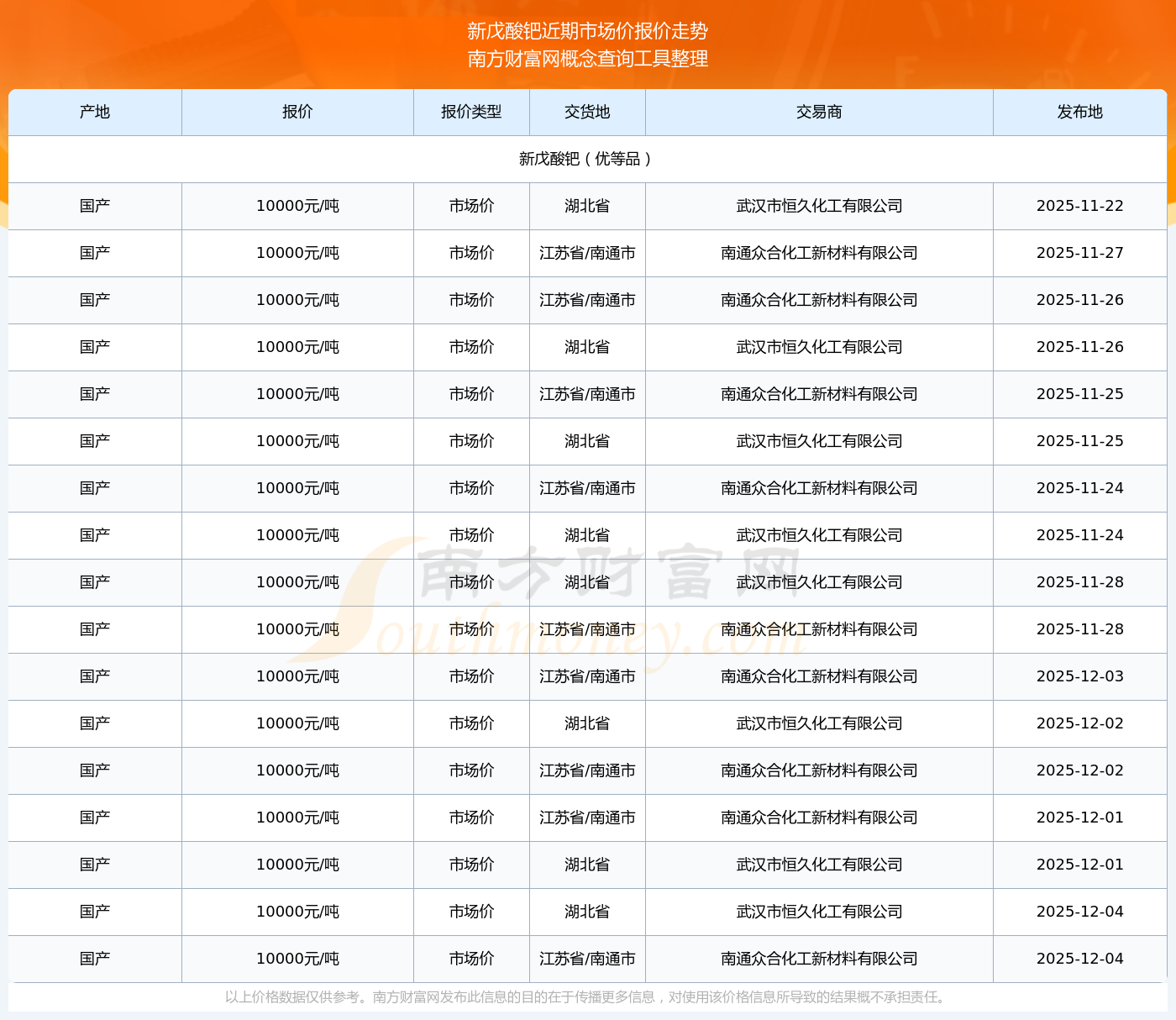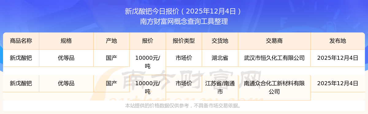 2025年12月4日,南通众合化工新材料有限公司新戊酸钯(优等品),国产,交易地点为江苏省/南通市,市场价报价为10000.00元/吨。