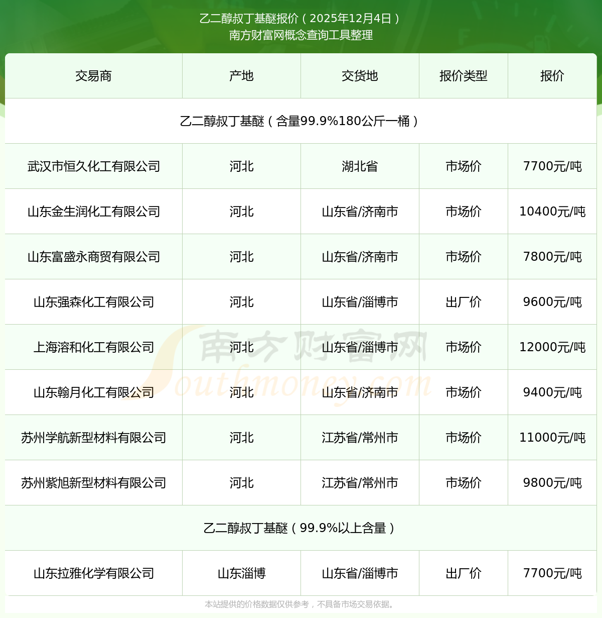 2025年12月4日,乙二醇叔丁基醚(含量99.9%180公斤一桶)价格为10400.00元/吨,报价人:山东金生润化工有限公司,交易地点为山东省/济南市。