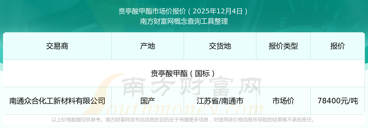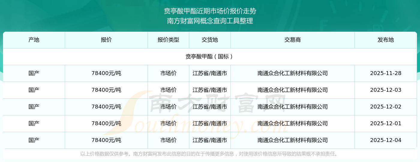 2025年12月4日,南通众合化工新材料有限公司贲亭酸甲酯(国标),国产,交易地点为江苏省/南通市,市场价报价为78400.00元/吨。