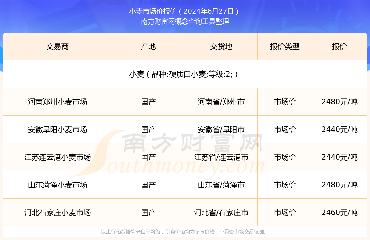 2024年6月27日,小麦(品种:硬质白小麦;等级:2;)市场价价格为2440.00元/吨,报价人:安徽阜阳小麦市场,交易地点为安徽省/阜阳市。