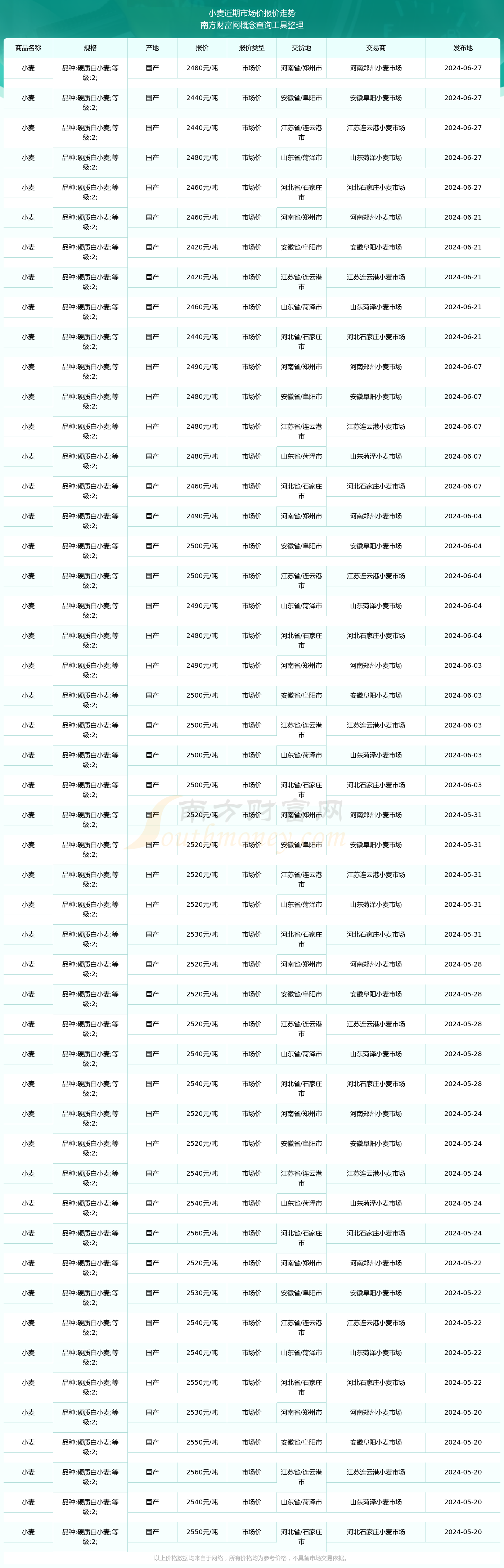 2024年6月27日,江苏连云港小麦市场小麦(品种:硬质白小麦;等级:2;),国产,交易地点为江苏省/连云港市,市场价报价为2440.00元/吨。