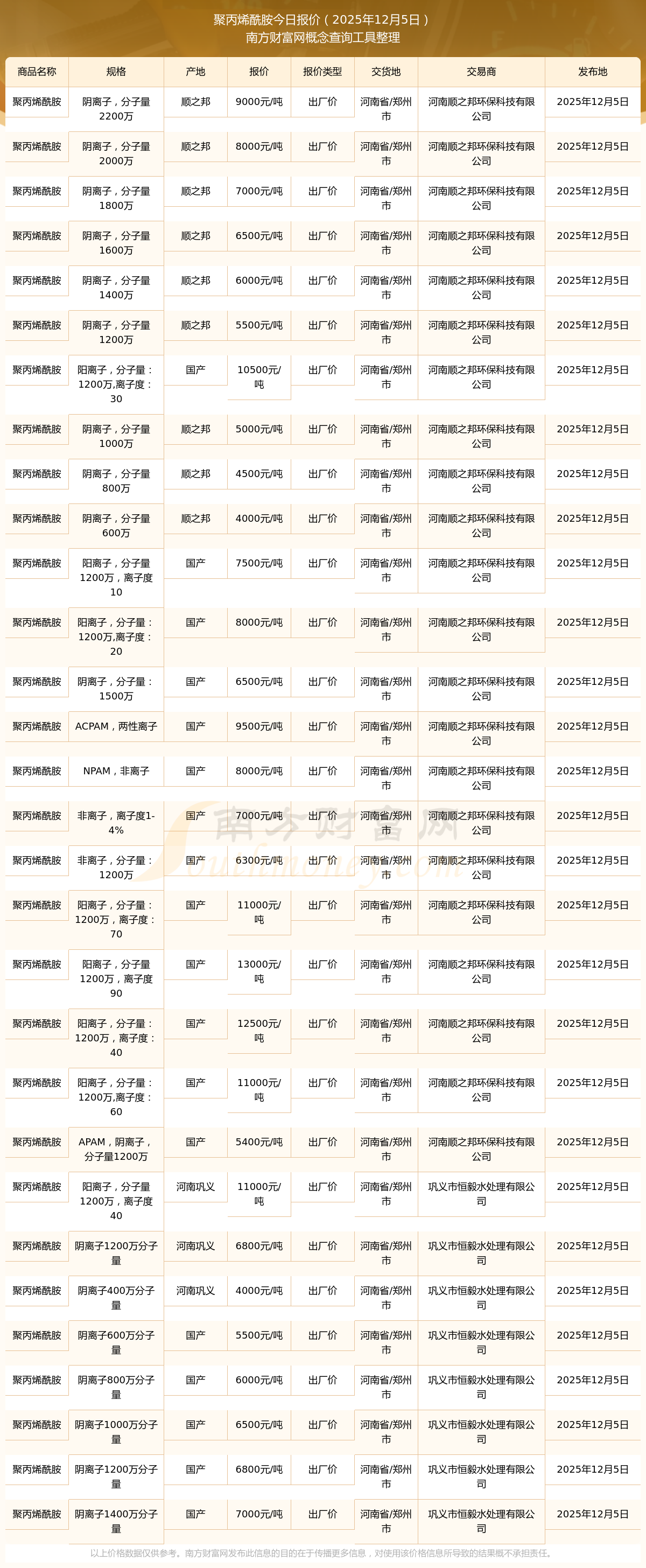 2025年12月5日,河南顺之邦环保科技有限公司聚丙烯酰胺(阴离子,分子量1800万),顺之邦,交易地点为河南省/郑州市,出厂价报价为7000.00元/吨。