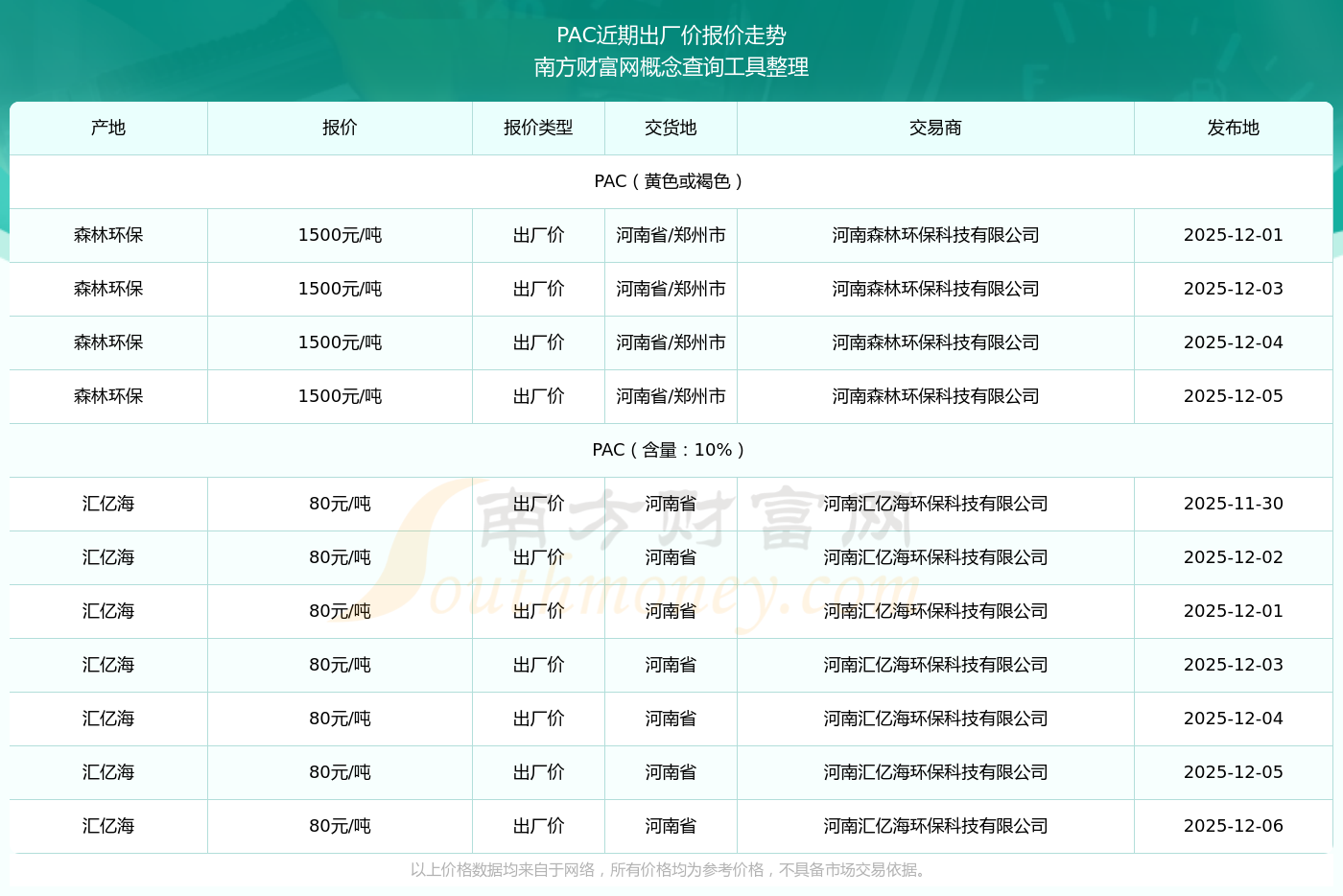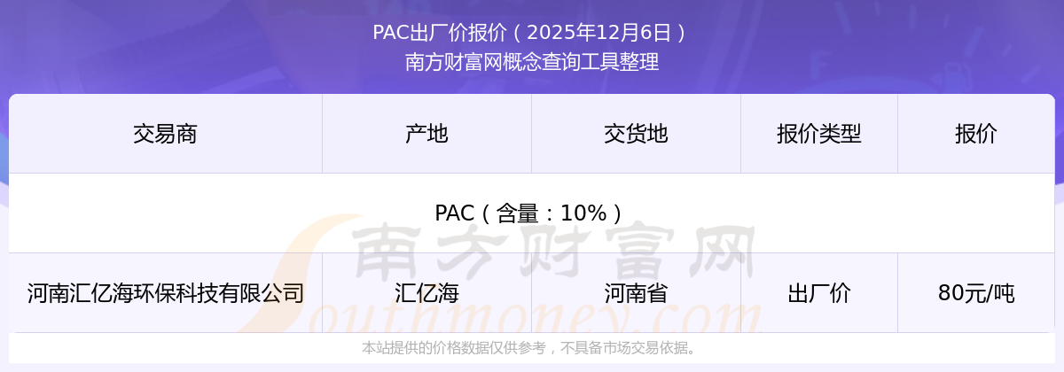 2025年12月6日,PAC(含量:10%)出厂价价格为80.00元/吨,报价人:河南汇亿海环保科技有限公司,交易地点为河南省。