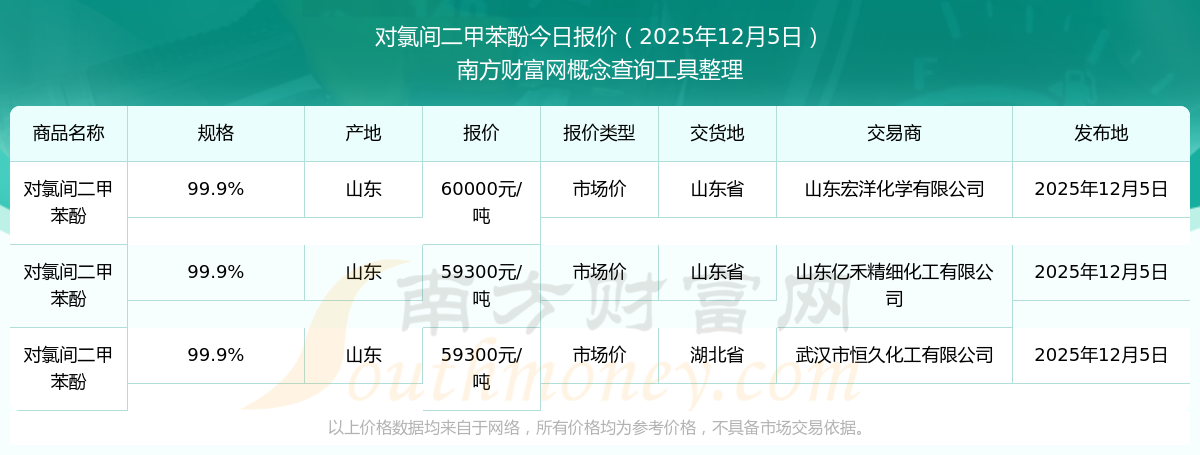 2025年12月5日,对氯间二甲苯酚(99.9%)市场价价格为60000.00元/吨,报价人:山东宏洋化学有限公司,交易地点为山东省。