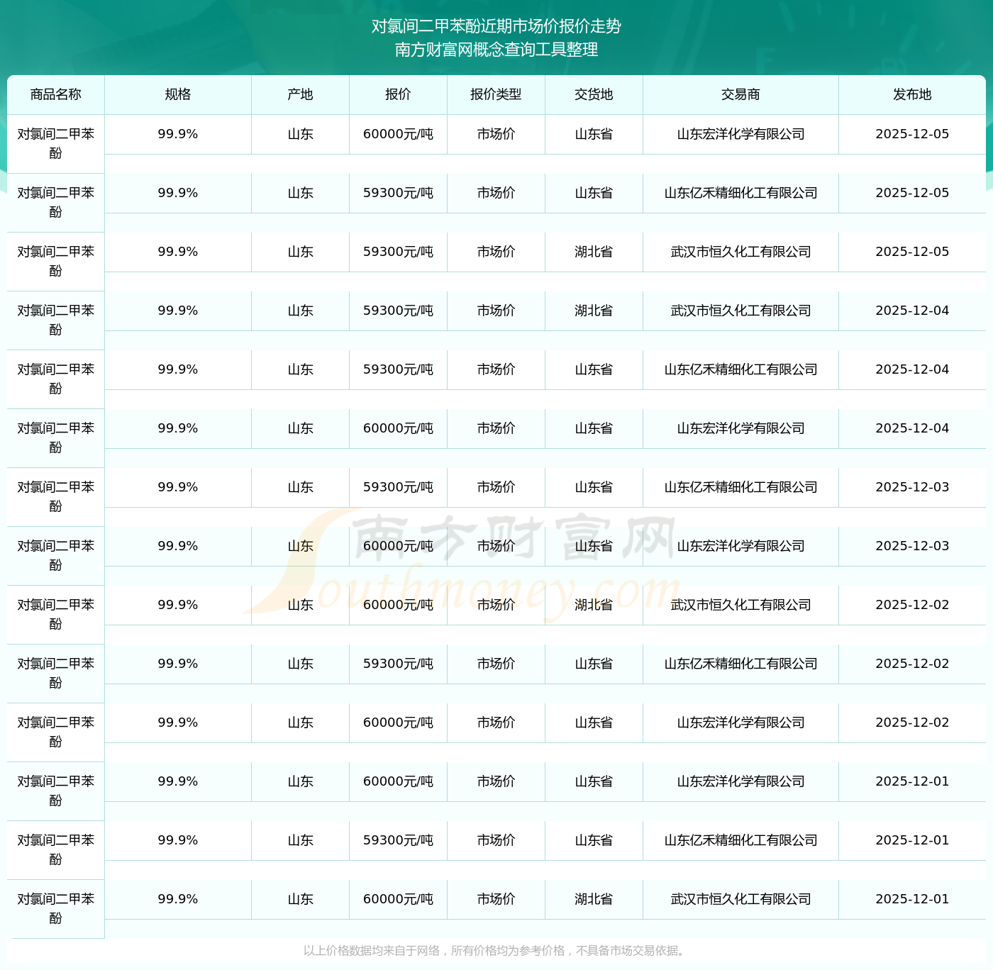 2025年12月5日,山东亿禾精细化工有限公司对氯间二甲苯酚(99.9%),山东,交易地点为山东省,市场价报价为59300.00元/吨。