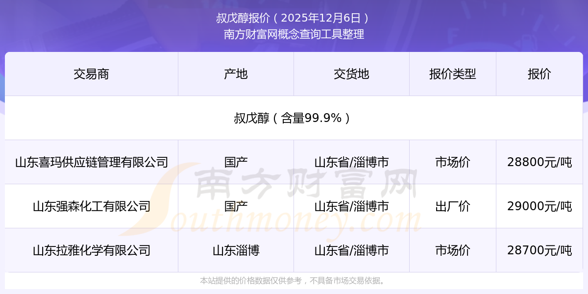 2025年12月6日,山东喜玛供应链管理有限公司叔戊醇(含量99.9%),国产,交易地点为山东省/淄博市,报价为28800.00元/吨。