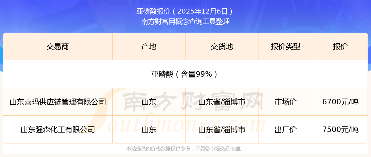2025年12月6日,山东强森化工有限公司亚磷酸(含量99%),山东,交易地点为山东省/淄博市,报价为7500.00元/吨。
