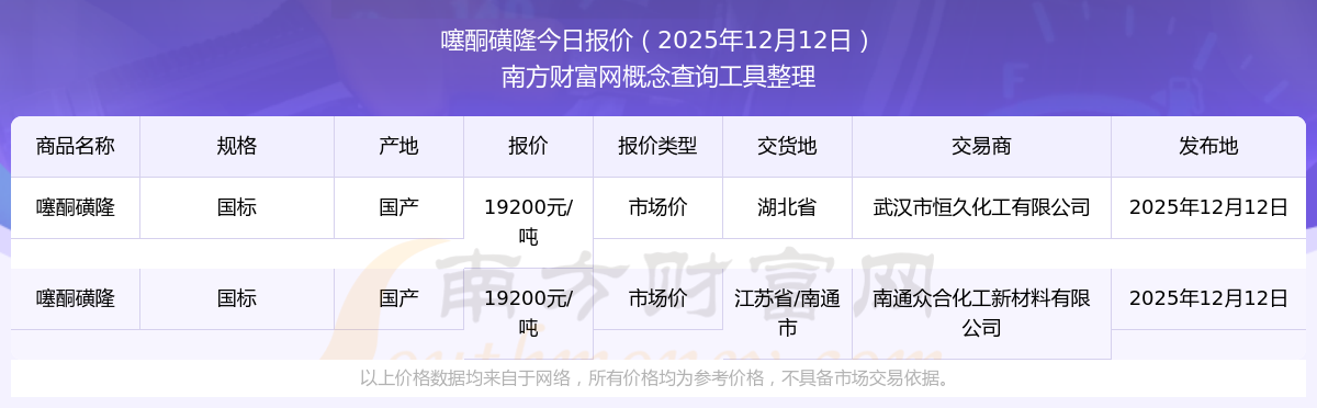 2025年12月12日,噻酮磺隆(国标)市场价价格为19200.00元/吨,报价人:南通众合化工新材料有限公司,交易地点为江苏省/南通市。