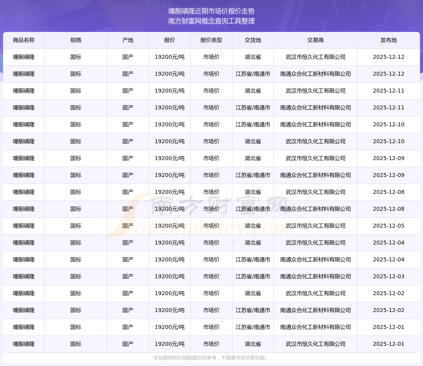 2025年12月12日,武汉市恒久化工有限公司噻酮磺隆(国标),国产,交易地点为湖北省,市场价报价为19200.00元/吨。