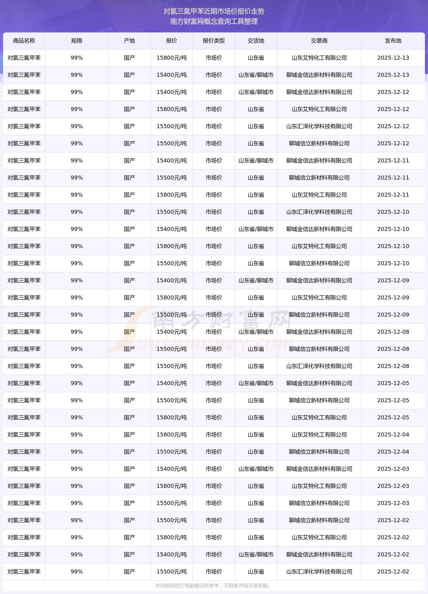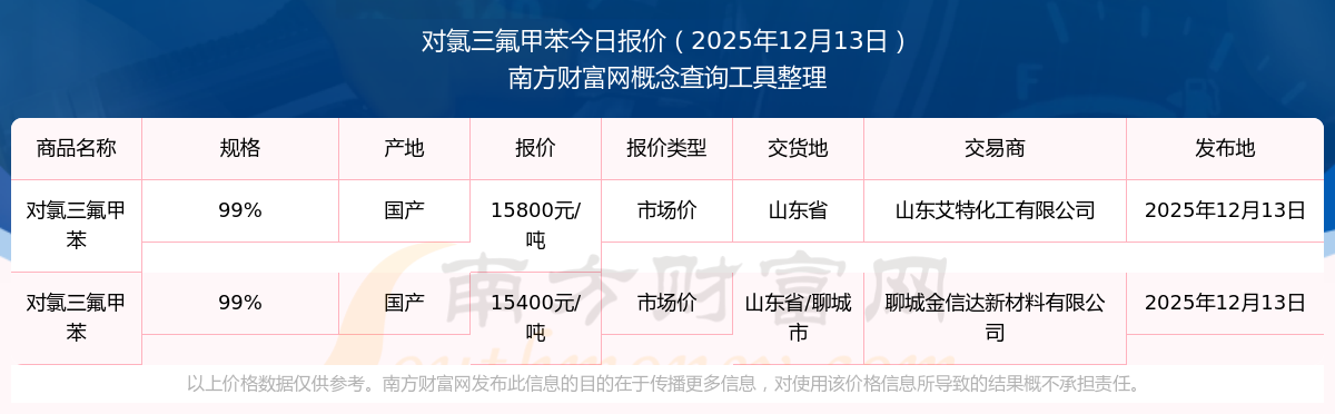 2025年12月13日,对氯三氟甲苯(99%)市场价价格为15800.00元/吨,报价人:山东艾特化工有限公司,交易地点为山东省。