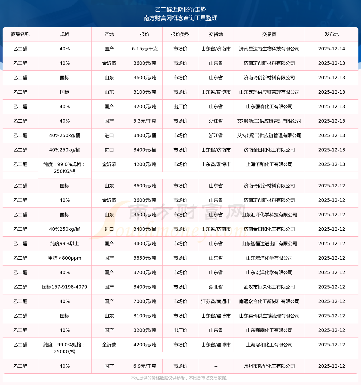 2025年12月14日,济南星达特生物科技有限公司乙二醛(40%),国产,交易地点为山东省/济南市,报价为6.15元/千克。