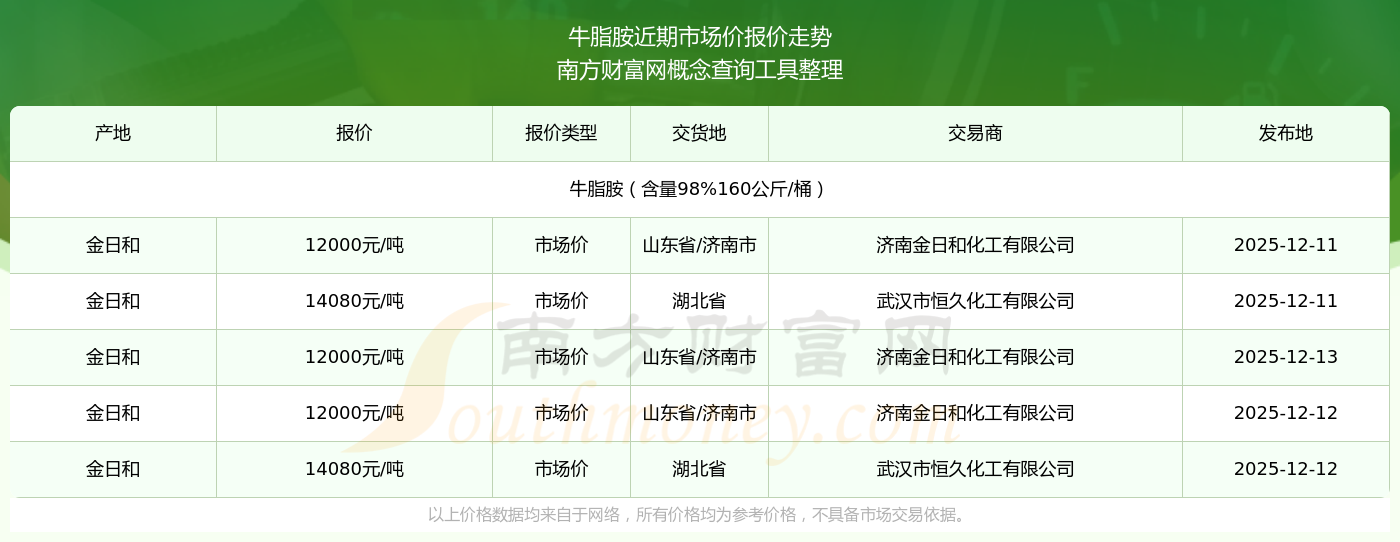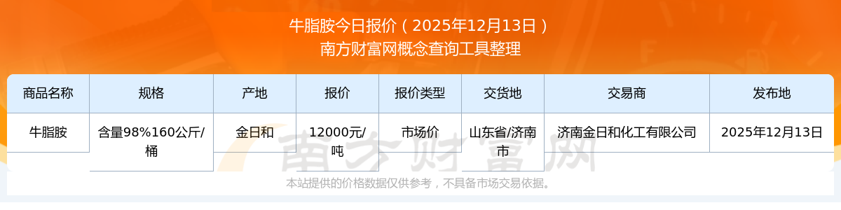 2025年12月13日,牛脂胺(含量98%160公斤/桶)市场价价格为12000.00元/吨,报价人:济南金日和化工有限公司,交易地点为山东省/济南市。