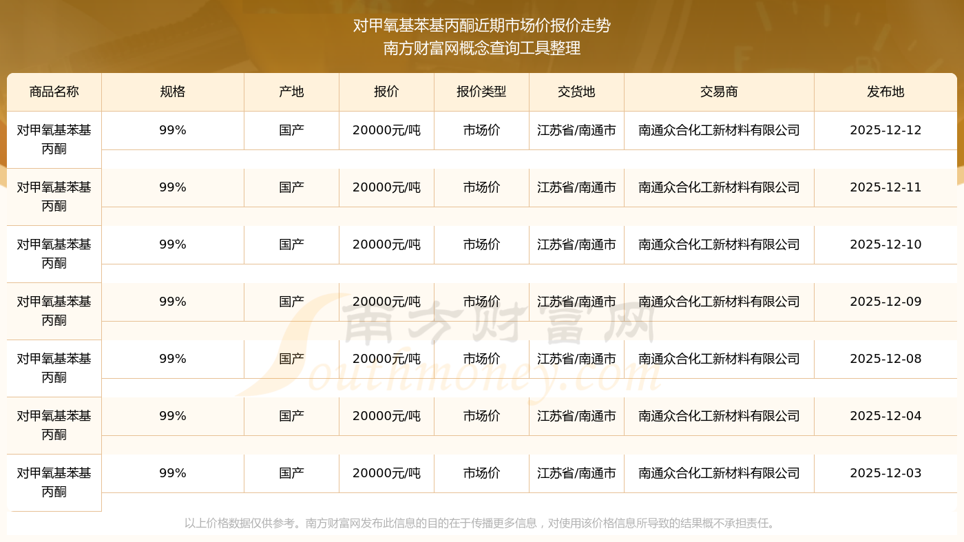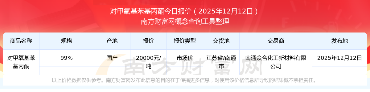 2025年12月12日,对甲氧基苯基丙酮(99%)市场价价格为20000.00元/吨,报价人:南通众合化工新材料有限公司,交易地点为江苏省/南通市。
