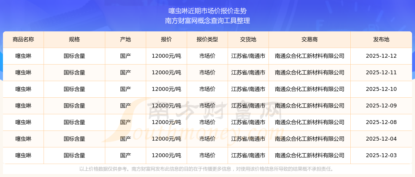 2025年12月12日,南通众合化工新材料有限公司噻虫啉(国标含量),国产,交易地点为江苏省/南通市,市场价报价为12000.00元/吨。