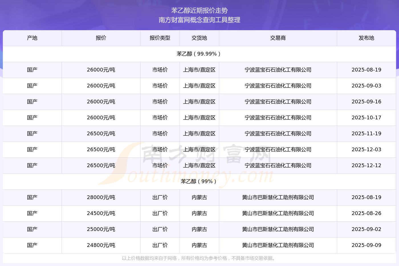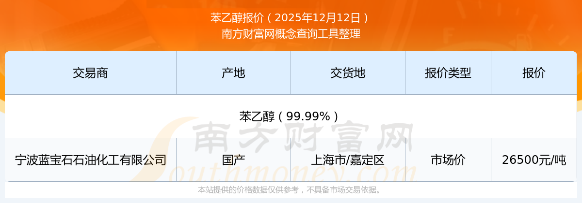2025年12月12日,苯乙醇(99.99%)价格为26500.00元/吨,报价人:宁波蓝宝石石油化工有限公司,交易地点为上海市/嘉定区。