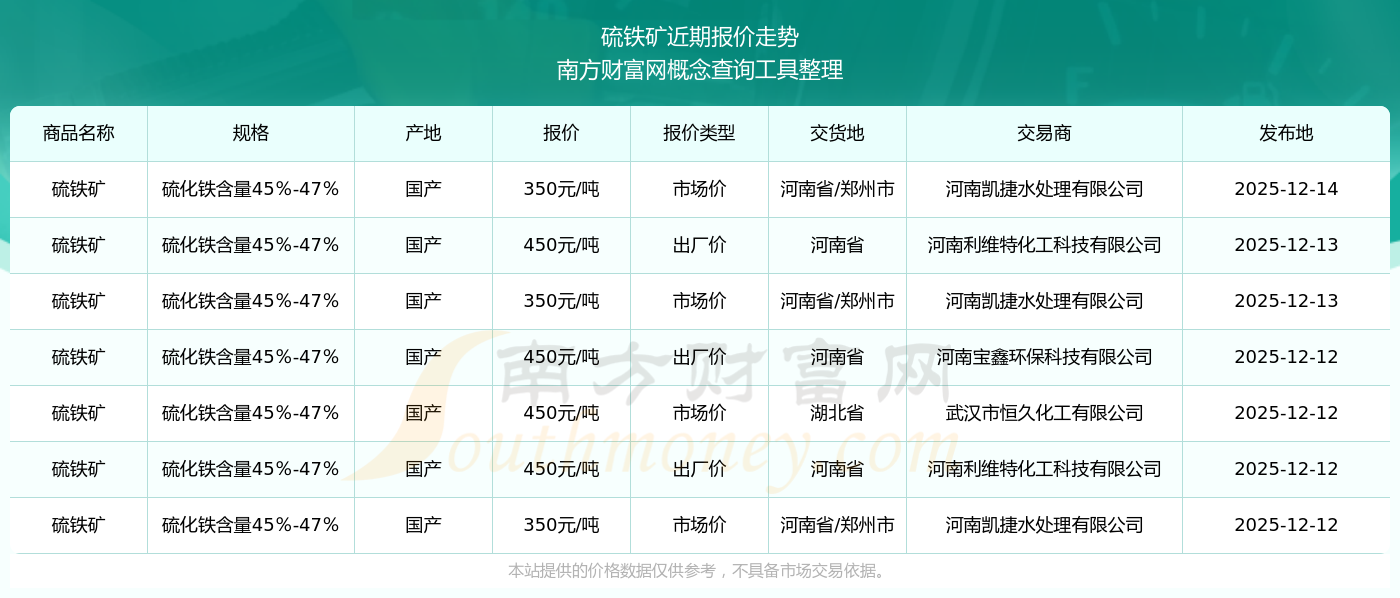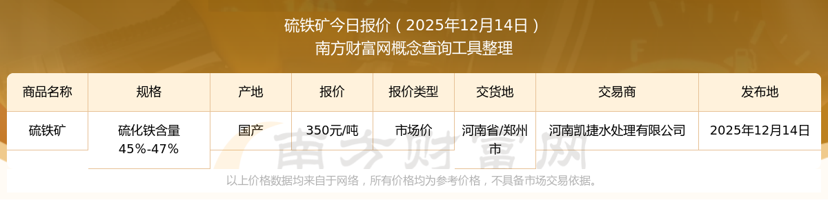2025年12月14日,河南凯捷水处理有限公司硫铁矿(硫化铁含量45%-47%),国产,交易地点为河南省/郑州市,报价为350.00元/吨。