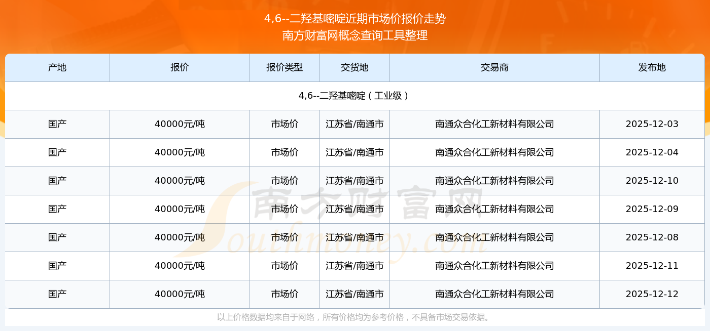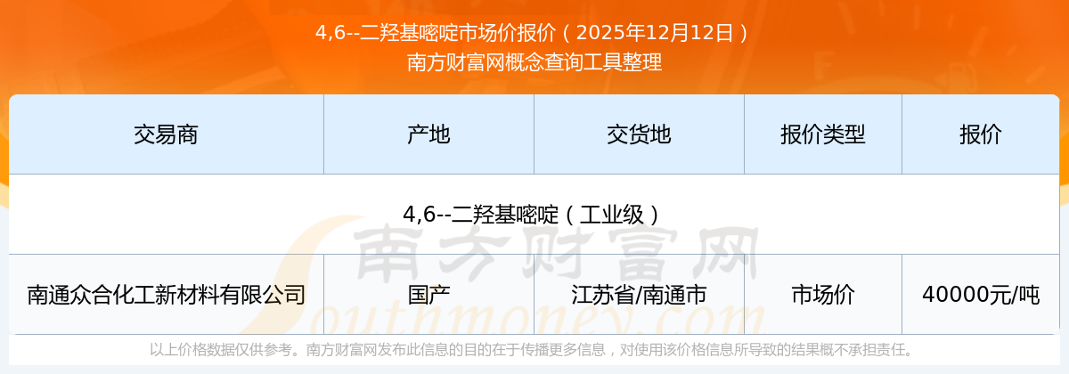 2025年12月12日,南通众合化工新材料有限公司4,6--二羟基嘧啶(工业级),国产,交易地点为江苏省/南通市,市场价报价为40000.00元/吨。