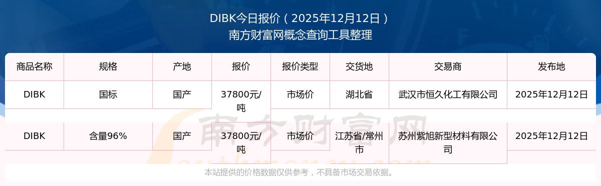 2025年12月12日,DIBK(含量96%)市场价价格为37800.00元/吨,报价人:苏州紫旭新型材料有限公司,交易地点为江苏省/常州市。