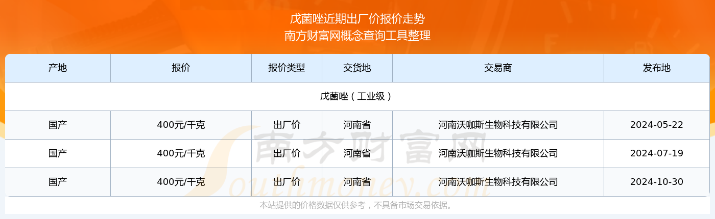2024年10月30日,河南沃咖斯生物科技有限公司戊菌唑(工业级),国产,交易地点为河南省,出厂价报价为400.00元/千克。