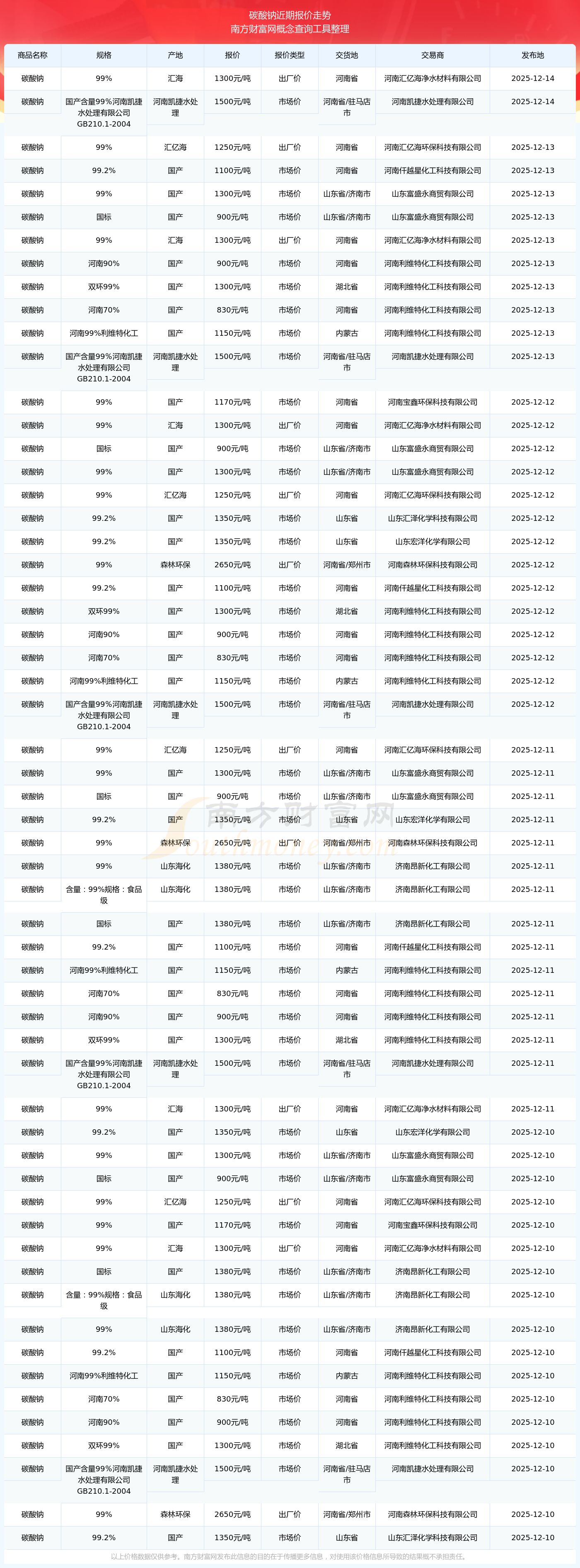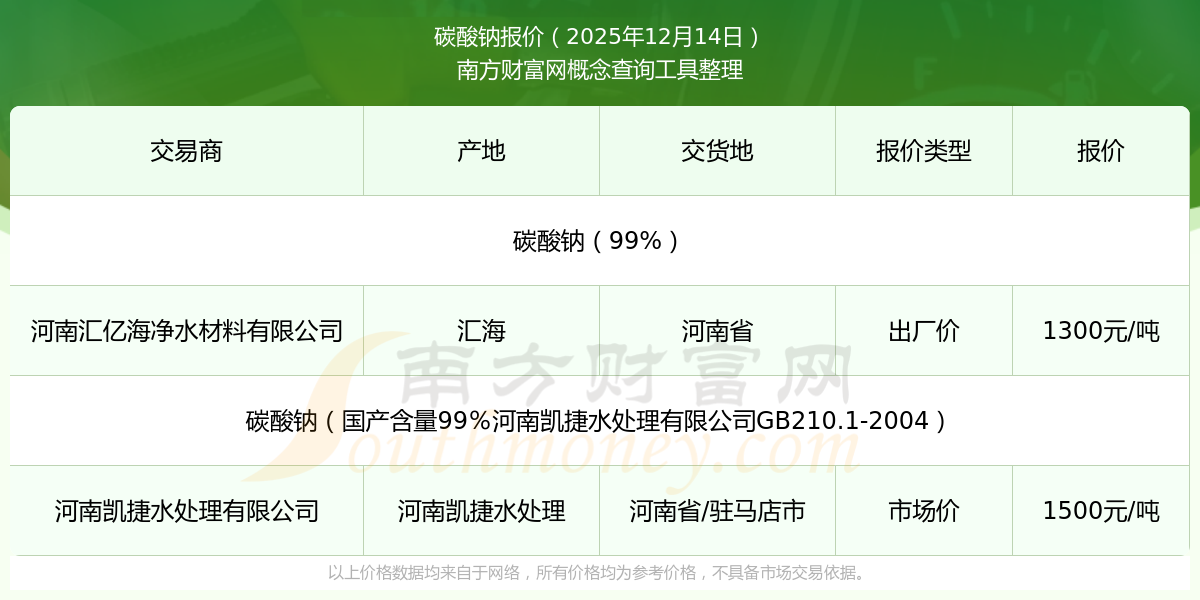 2025年12月14日,碳酸钠(99%)价格为1300.00元/吨,报价人:河南汇亿海净水材料有限公司,交易地点为河南省。
