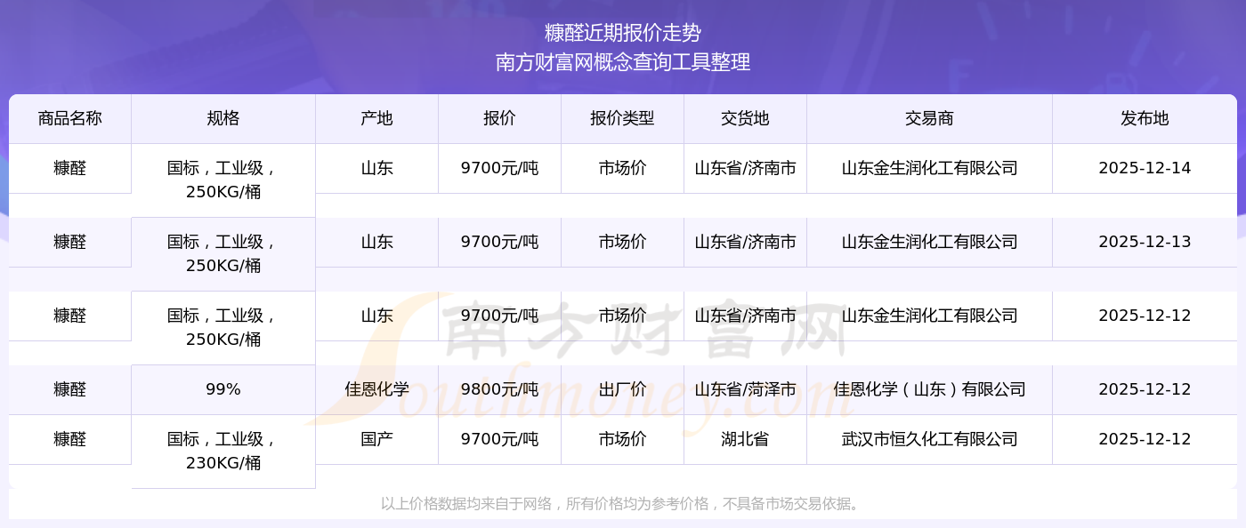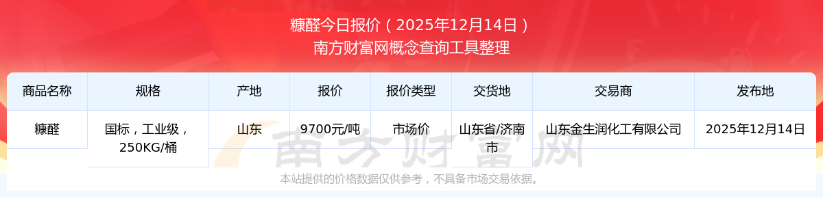 2025年12月14日,山东金生润化工有限公司糠醛(国标,工业级,250KG/桶),山东,交易地点为山东省/济南市,报价为9700.00元/吨。