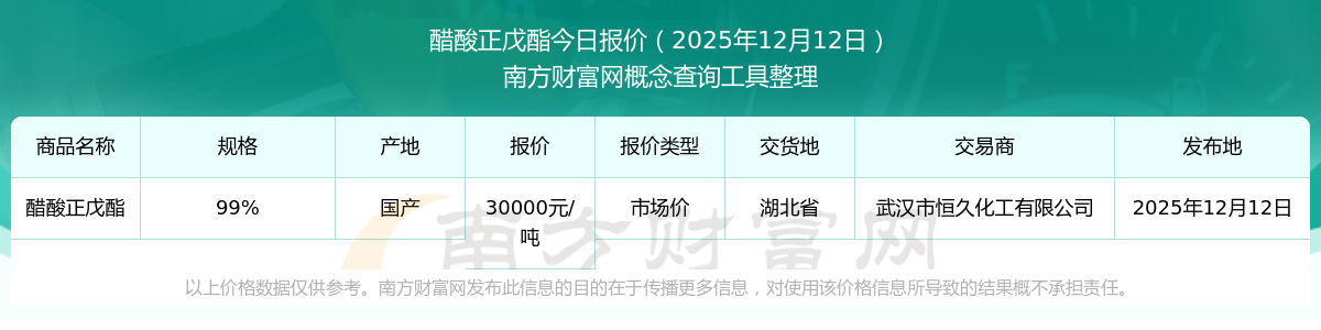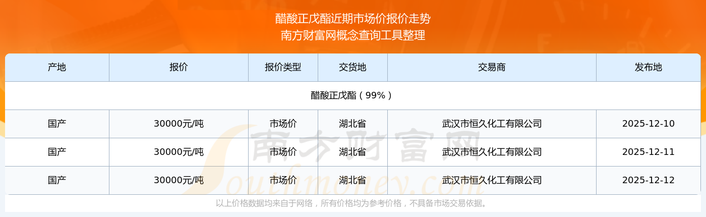 2025年12月12日,武汉市恒久化工有限公司醋酸正戊酯(99%),国产,交易地点为湖北省,市场价报价为30000.00元/吨。