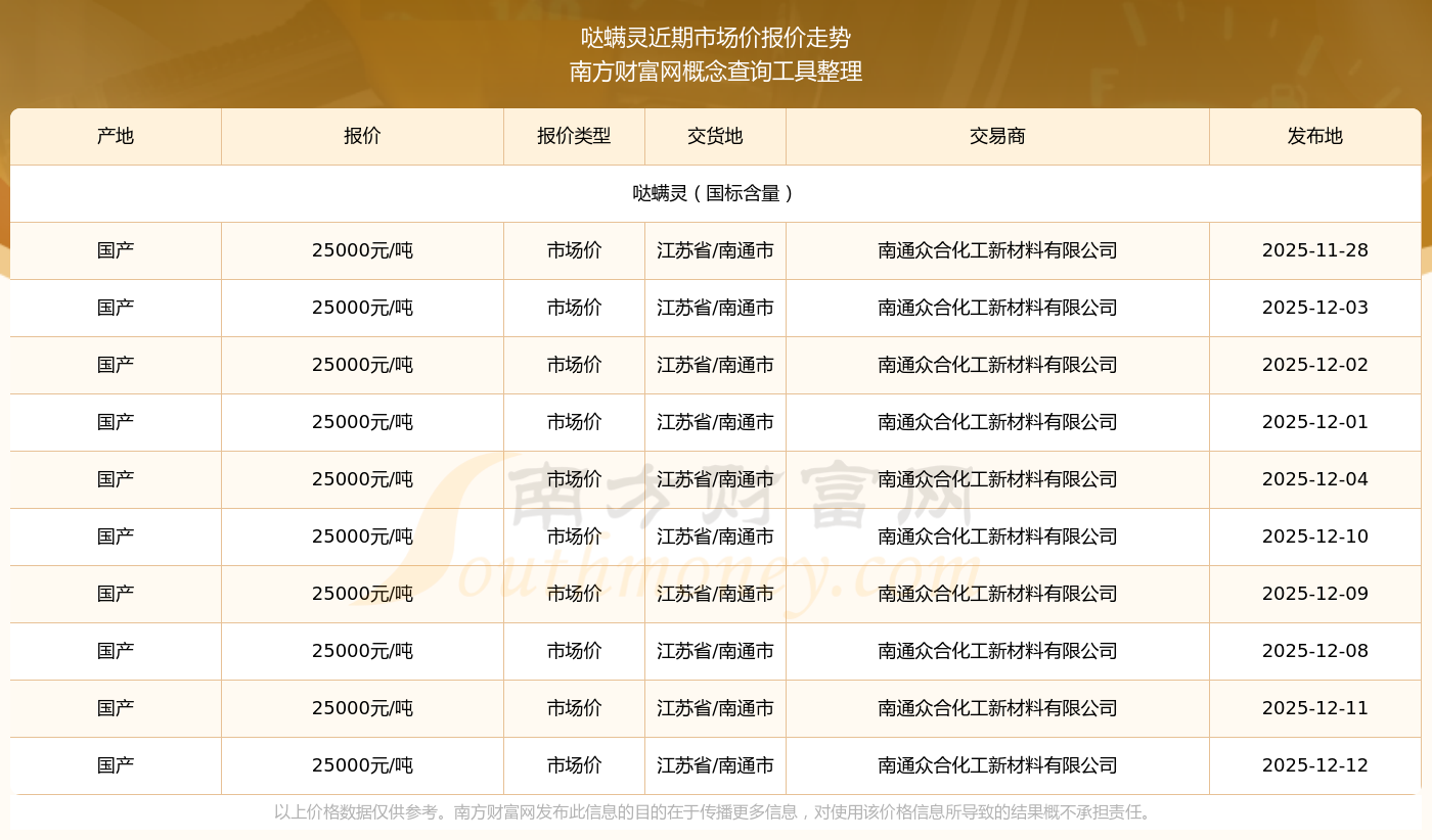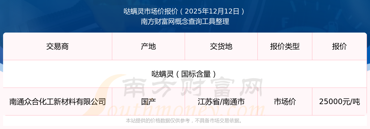 2025年12月12日,南通众合化工新材料有限公司哒螨灵(国标含量),国产,交易地点为江苏省/南通市,市场价报价为25000.00元/吨。