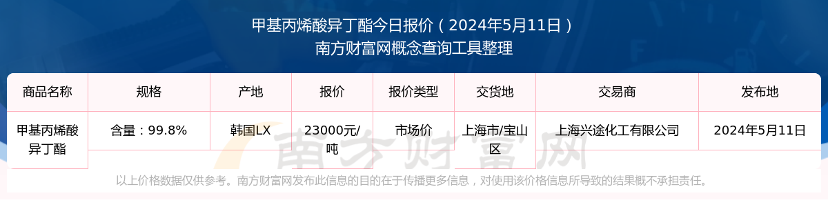 2024年5月11日,上海兴途化工有限公司甲基丙烯酸异丁酯(含量:99.8%),韩国LX,交易地点为上海市/宝山区,市场价报价为23000.00元/吨。