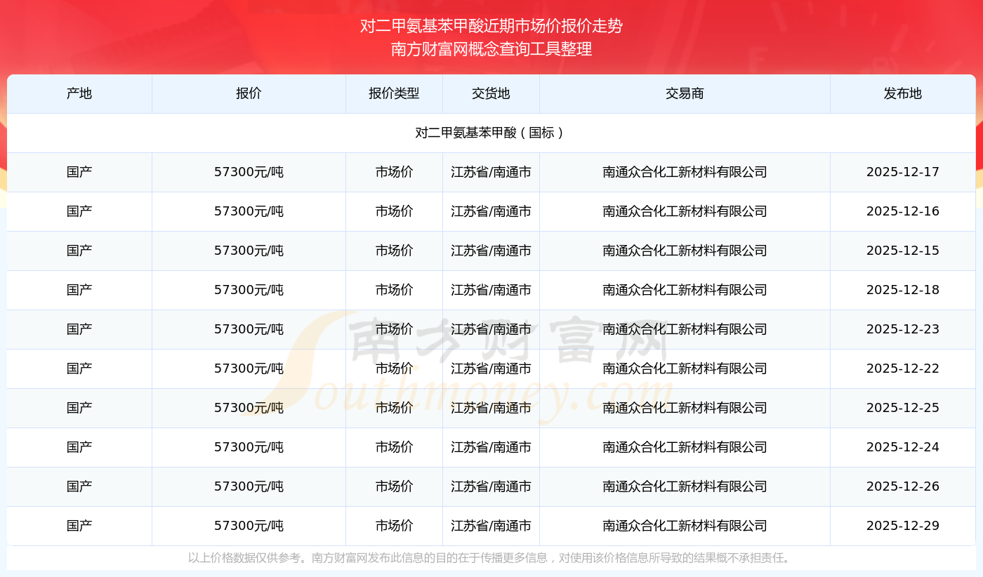 2025年12月29日,对二甲氨基苯甲酸(国标)市场价价格为57300.00元/吨,报价人:南通众合化工新材料有限公司,交易地点为江苏省/南通市。