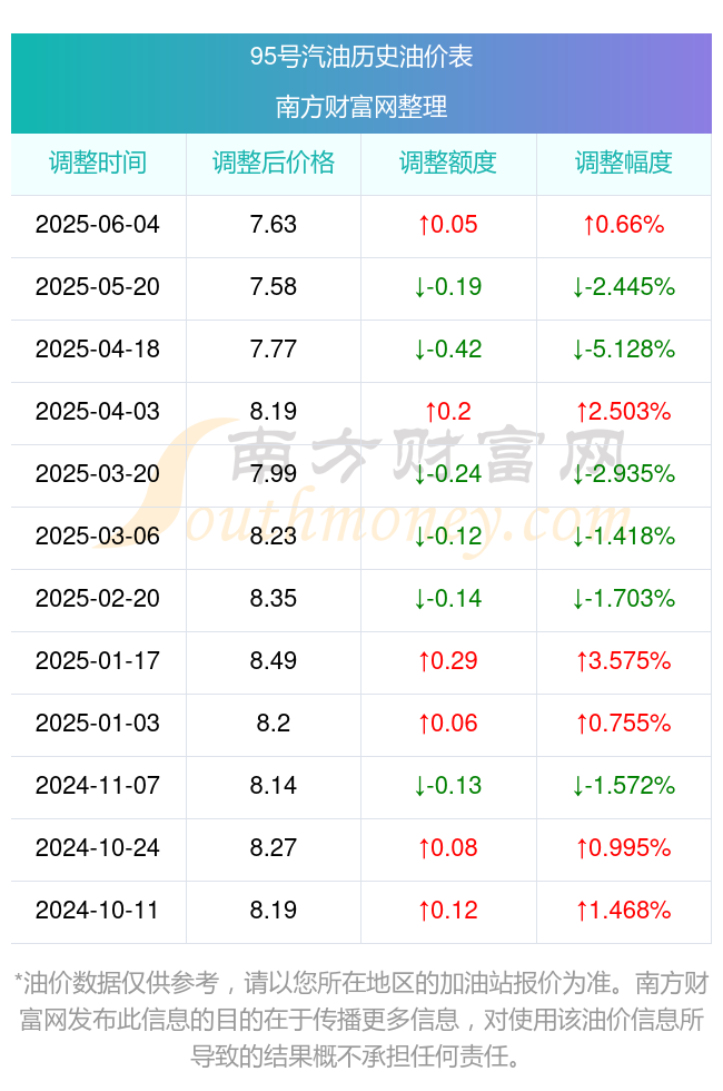 汽油、柴油6月10日每升的价格为:92号汽油7.11元;95号汽油7.63元;89号汽油6.55元;0号柴油6.68元,本次油价调整时间是6月4日。下一轮油价调整时间6月17日24时,距离现在还有7.57天。