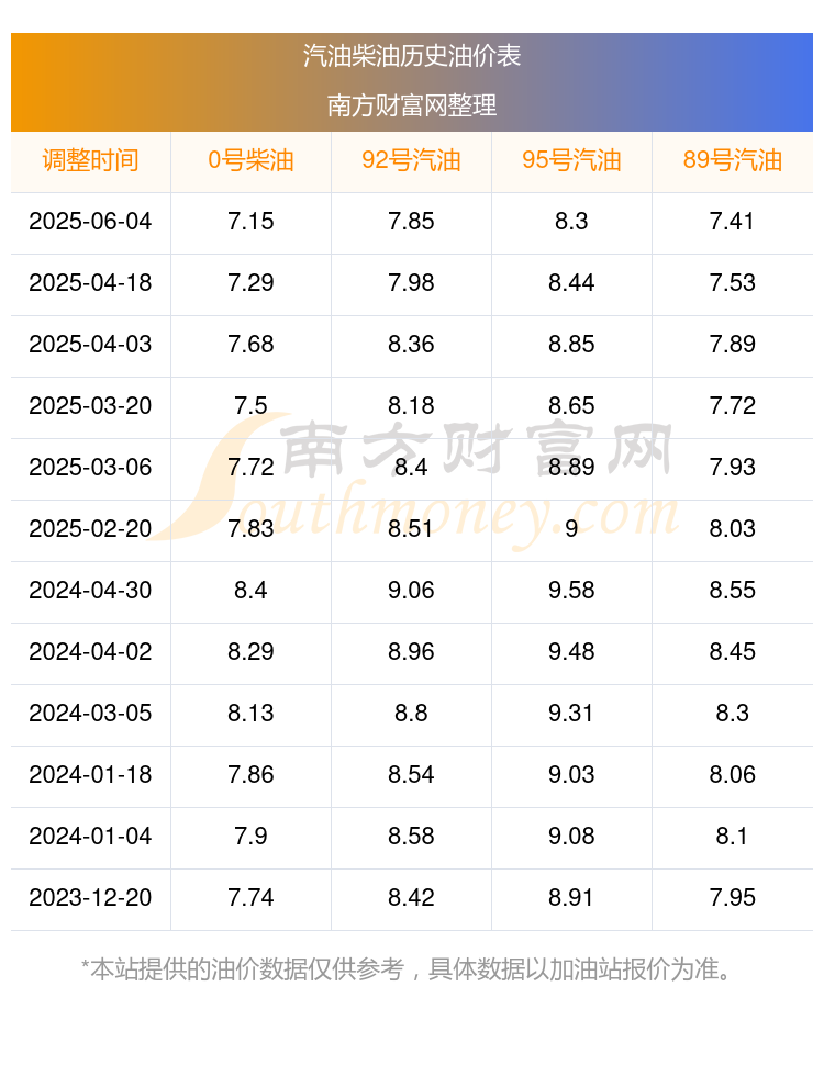 2025年汽油柴油油价调整一览表