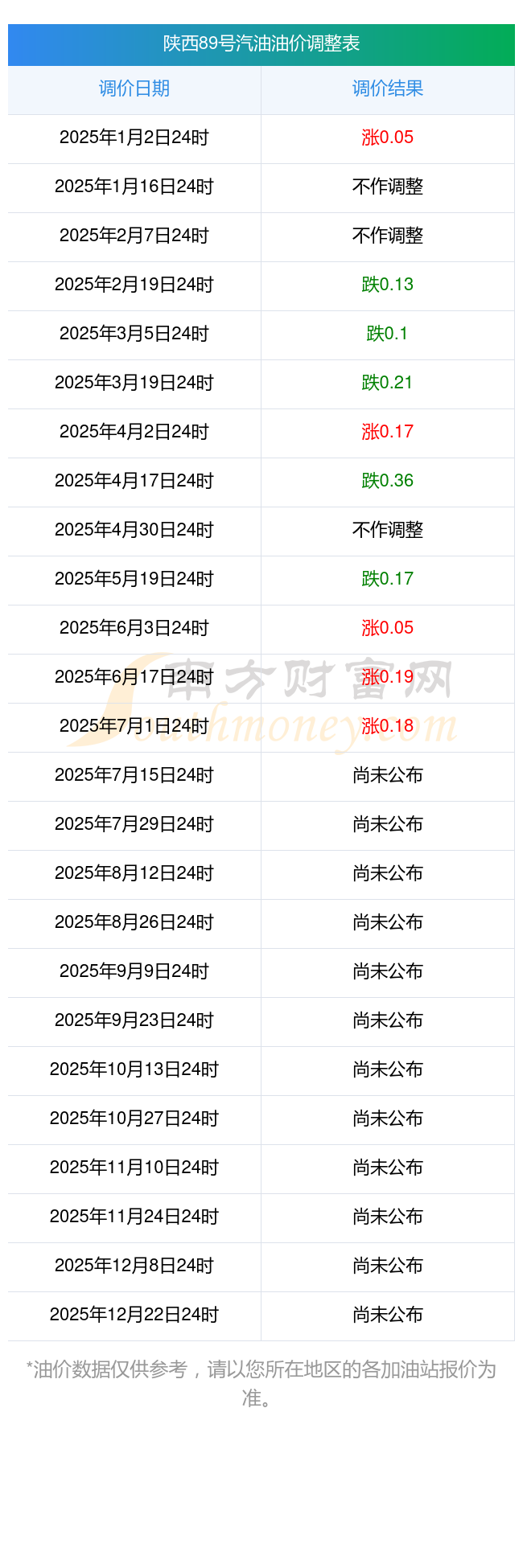2025年陕西延安历史油价调整查询表一览89号汽油