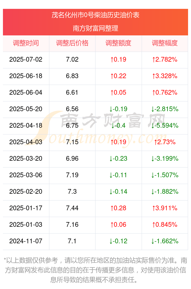 7月2日茂名化州市0号柴油历史油价调整一览表