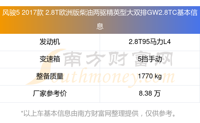 风骏5 2017款 2.8T欧洲版柴油两驱精英型大双排GW2.8TC搭载了一台2.8T95马力L4涡轮增压发动机,采用5挡手动挡变速箱,常规整备质量1770kg,厂家参考价8.38万元。
