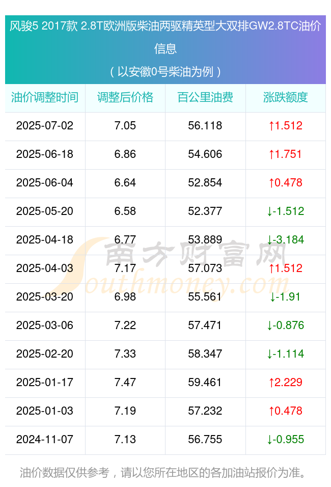 按7月2日0号柴油最新调整价格7.05元每升来计算(以安徽为例),该车型百公里平均油费为56.118元,按上一轮6月18日调整价格6.86元每升来计算,百公里平均油费为54.606元,对比上一轮多花1.512元,下一轮油价调整时间为7月15日24时。