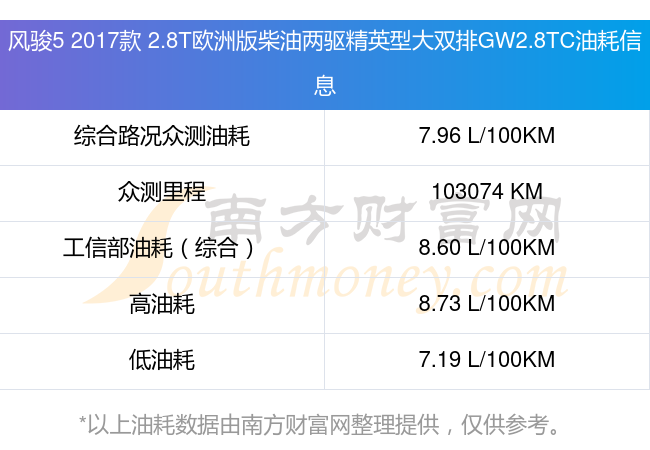 数据仅供参考,一般现实油耗与测试值会有差异,请以实际油耗为准。