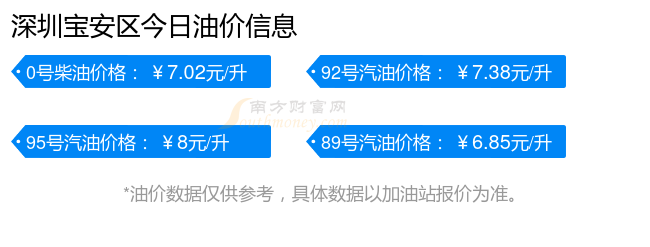 7月15日,深圳宝安区汽油、柴油每升的价格是多少?本次油价调整时间是7月2日,92号汽油为7.38元,上升了0.19元,上升幅达2.64%;95号汽油为8元,上升了0.21元,上升幅达2.7%;89号汽油为6.85元,上升了0.17元,上升幅达2.55%;0号柴油为7.02元,上升了0.19元,上升幅达2.78%。