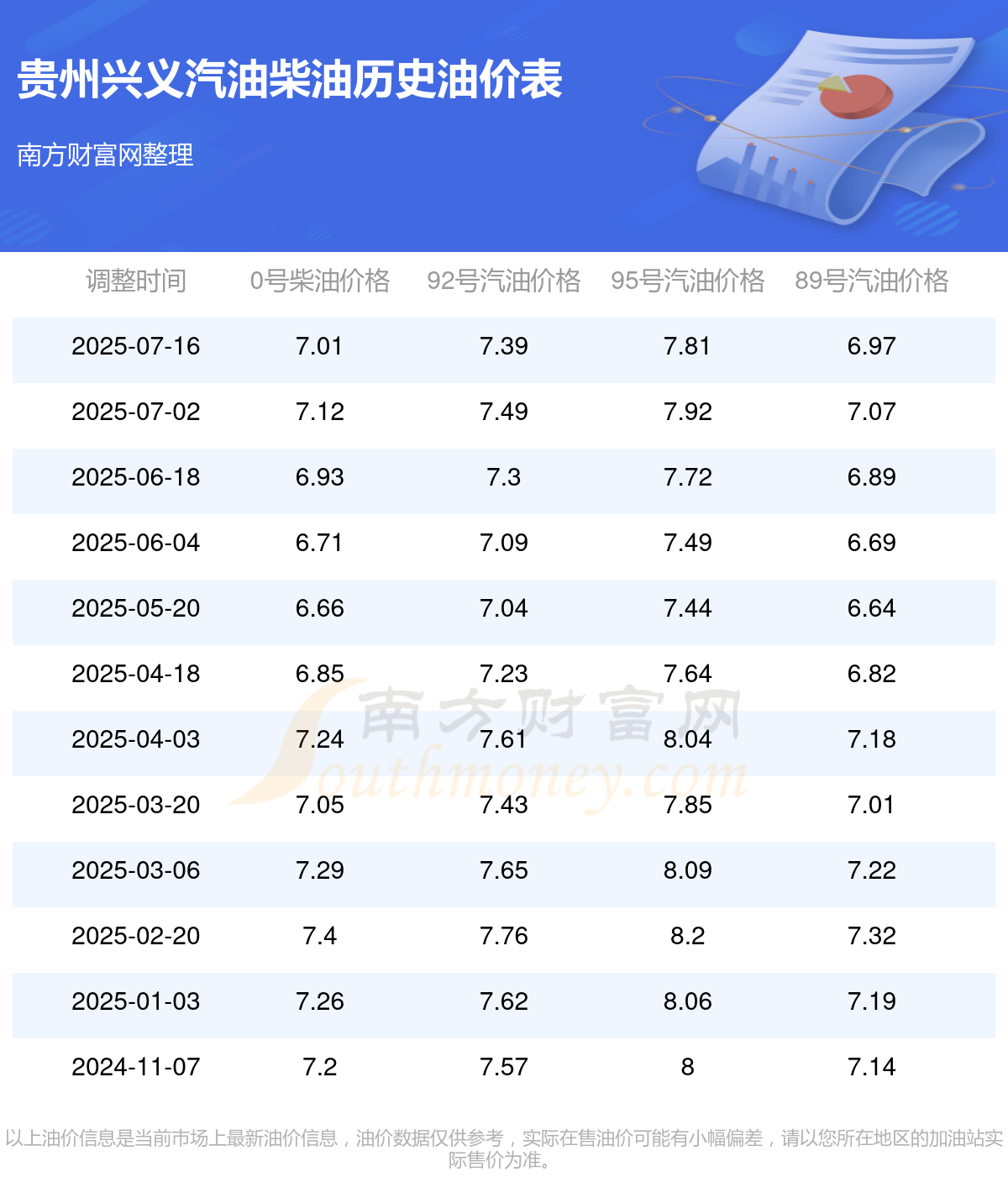 贵州兴义汽油、柴油7月16日每升的价格为:92号汽油7.39元;95号汽油7.81元;89号汽油6.97元;0号柴油7.01元,本次油价调整时间是7月16日。