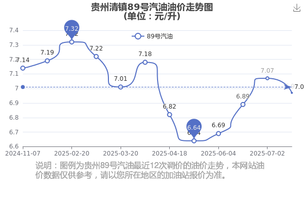 油价调整最新消息:7月22日,贵州清镇汽油、柴油每升最新价格为:92号汽油为7.39元,跌了0.1元;95号汽油为7.81元,跌了0.11元;89号汽油为6.97元,跌了0.1元;0号柴油为7.01元,跌了0.11元,调整时间为7月16日。贵州清镇下一轮油价调整时间7月29日24时,距离现在还有7.74天。
