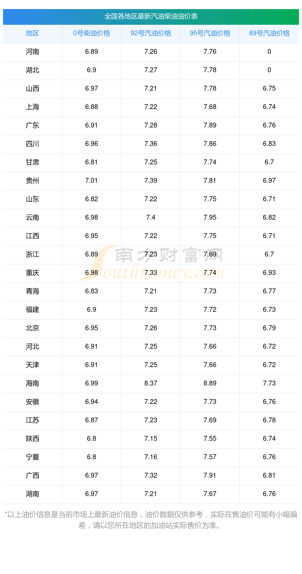 以上数据仅供参考,请以您所在地区的加油站实际售价为准。南方财富网发布此信息的目的在于传播更多信息,对使用该油价信息所导致的结果概不承担责任。
