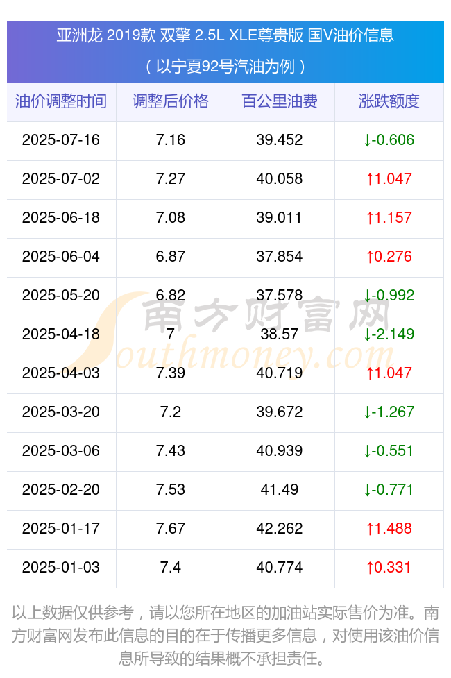 根据7月16日92号汽油最新调整价格7.16元/升来计算(以宁夏为例),该车型每百公里的平均油费是39.452元,上一轮7月2日调整价格7.27元每升来计算,每百公里的平均油费是40.058元,对比上一轮少花0.606元,下一轮的油价调整时间是7月29日24时。
