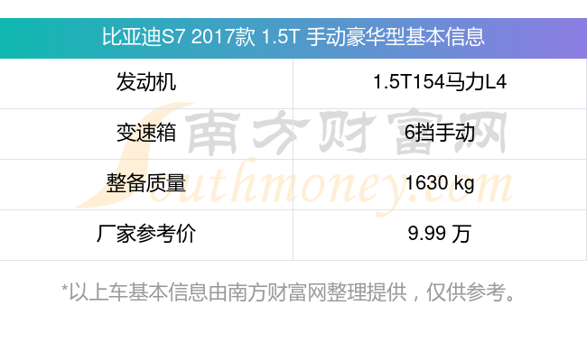 在动力上,比亚迪S7 2017款 1.5T 手动豪华型配备的是一台1.5T154马力L4涡轮增压发动机,匹配的是6挡手动挡变速箱,燃料形式为汽油,常规整备质量1630kg,厂家参考价9.99万元。