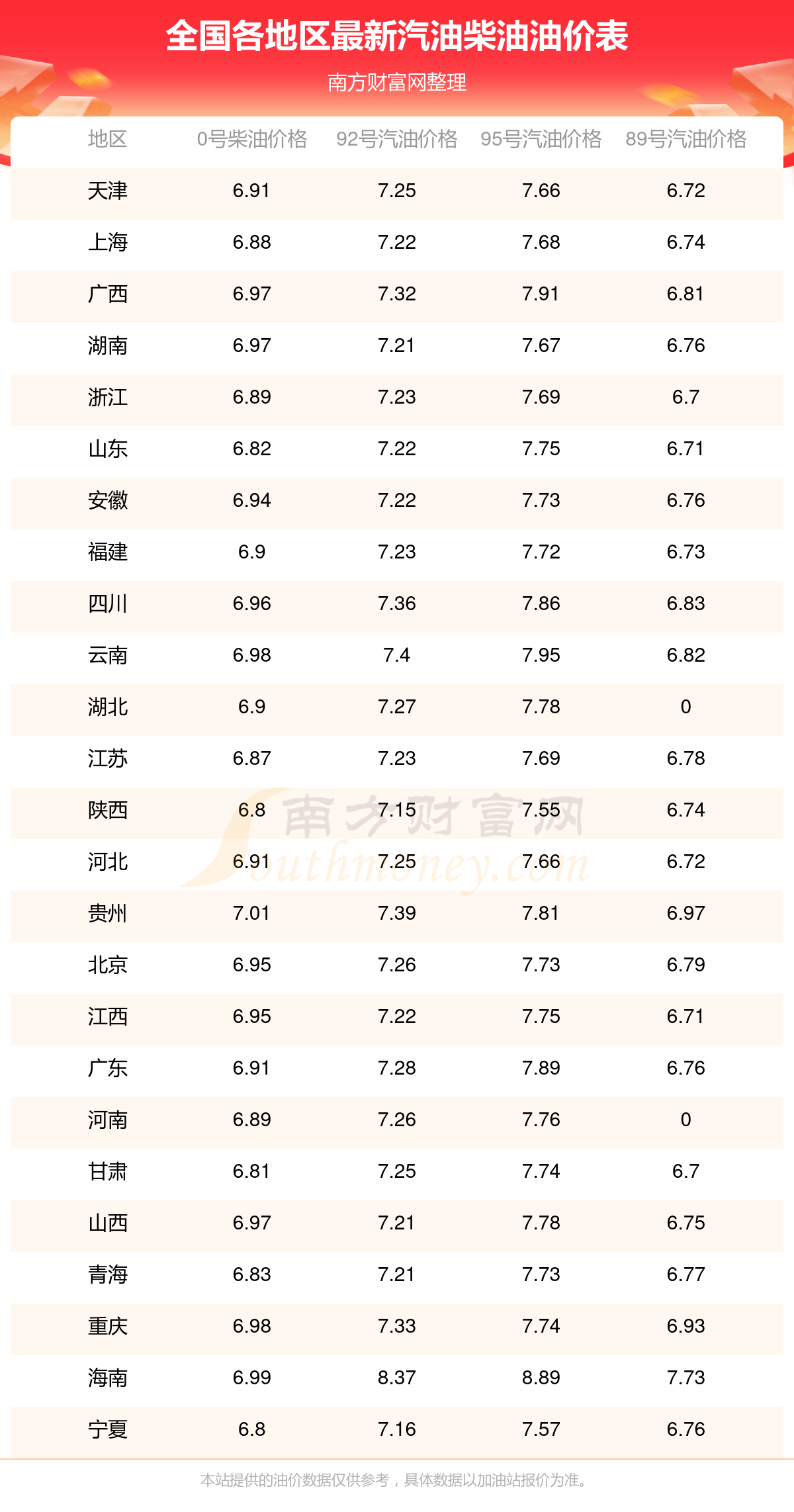 以上油价信息是当前市场上最新油价信息,油价数据仅供参考,实际在售油价可能有小幅偏差,请以您所在地区的加油站实际售价为准。