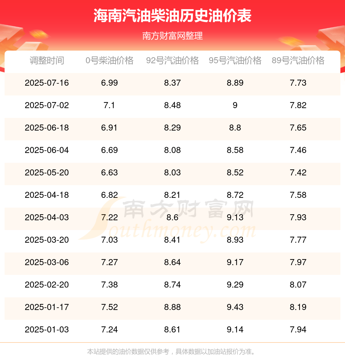 7月29日,海南95号汽油的价格是8.89元每升,本次的调整时间为7月16日,对比上次的调整下降了0.11元,下降1.222%,7月29日24时为下一轮油价调整时间,还有0.95天。