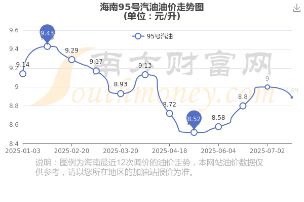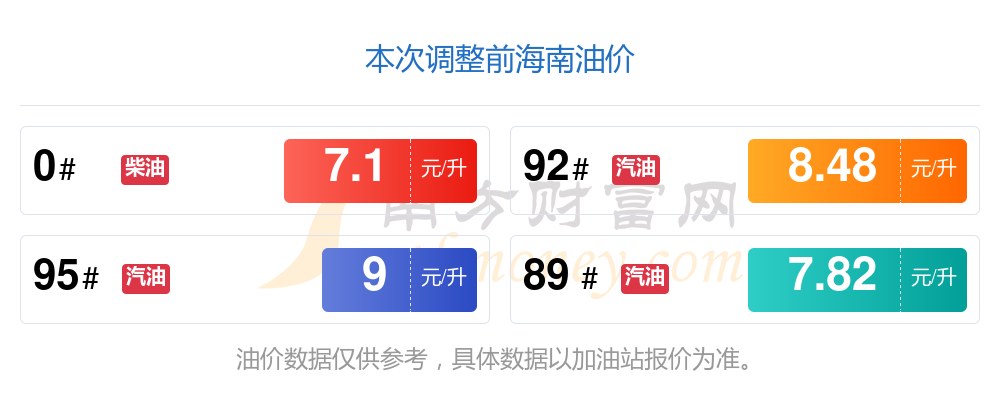 7月29日,海南汽油、柴油每升最新价格为:92号汽油为8.37元,下跌了0.11元;95号汽油为8.89元,下跌了0.11元;89号汽油为7.73元,下跌了0.09;0号柴油为6.99元,下跌了0.11元,调整时间为7月16日。