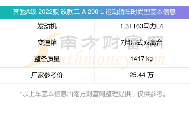 奔驰A级 2022款 改款二 A 200 L 运动轿车时尚型动力方面,搭载的是一台1.3T163马力L4涡轮增压发动机,匹配7挡湿式双离合自动档变速箱,燃料形式为汽油,常规整备质量1417kg,厂家参考价25.44万元。