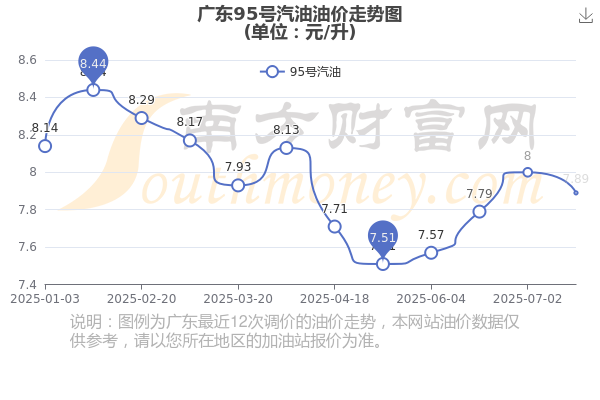 8月2日,广东95号汽油的价格是7.89元每升,本次的调整时间为7月16日,对比上次的调整下跌了0.11元,下跌1.375%,下次调整时间为8月12日24时,还有10.35天。