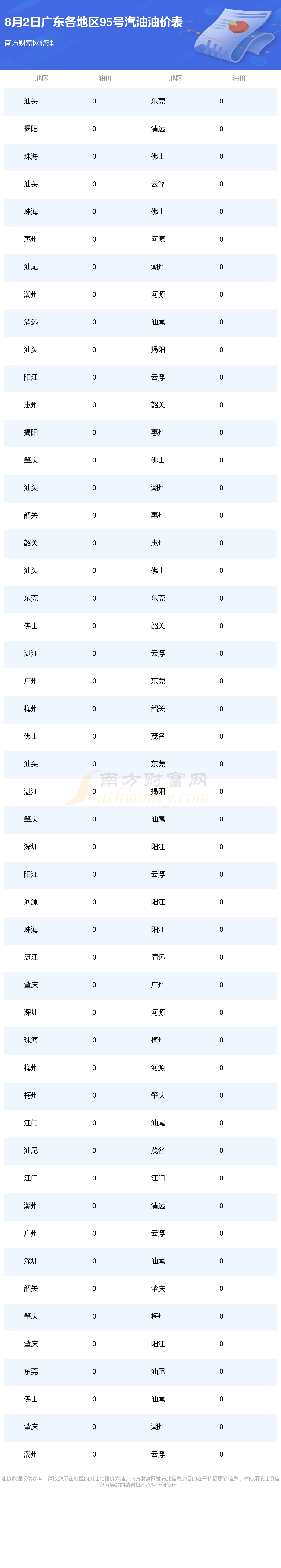 2025年8月2日广东95号汽油最新价格一览表