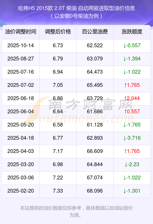 哈弗H5 2015款 2.0T 柴油 自动两驱进取型的真实油耗是多少?(10月14日)全国油价一览表
