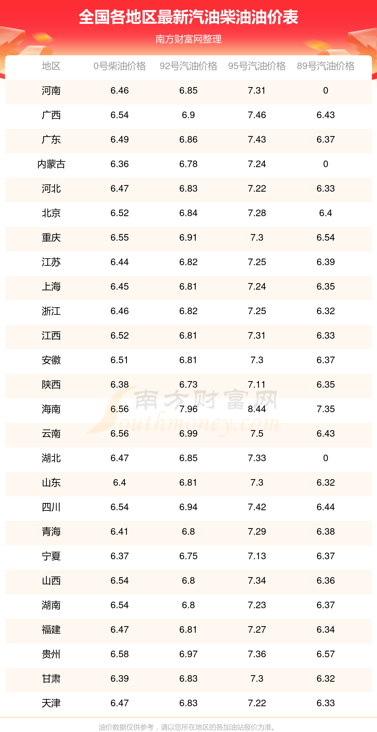 全国89号汽油最新平均价格为:6元每升,其中,最高为海南,价格为7.35元/升,最低为浙江,价格为6.32元/升。